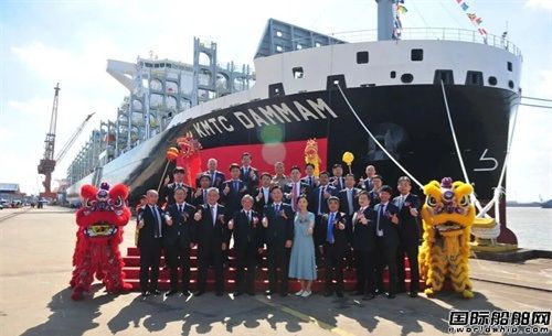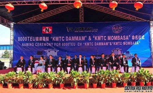 命名人鄭顯墉先生將新船命名為“KMTC DAMMAM”輪,教母金圣姬女士為新船砍纜、擲香檳禮、拉響汽笛,并與嘉賓共同登船參觀,祝福隨船船員航行平安,為船東以及相關(guān)合作方帶來榮譽(yù)和財(cái)富。