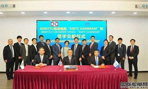 在各方代表的見證下,同日上午,日鮮海運(yùn)株式會(huì)社社長阿部克也先生,東洋船舶株式會(huì)社營業(yè)部部長藤本有一先生,以及揚(yáng)子江船業(yè)集團(tuán)副總經(jīng)理兼新?lián)P子造船總經(jīng)理杜成忠先生共同簽署“KMTC DAMMAM”輪交船文件。