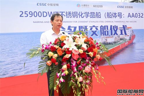 9月26日上午,中國船舶集團(tuán)集團(tuán)武昌造船聯(lián)合中船貿(mào)易為興通海運(yùn)股份有限公司建造的首艘25900DWT不銹鋼化學(xué)品船“興通海獅(XT SEA LION)”輪在江蘇靖江舉行命名暨交船儀式。