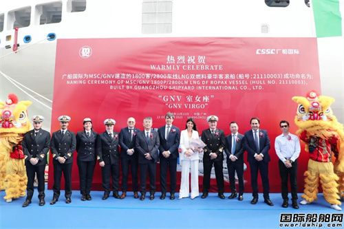 10月23日,由中國船舶集團所屬廣船國際為全球領先的運輸與物流企業地中海航運集團旗下客渡輪運營商Grandi Navi Veloci(GNV)量身打造的一艘現代化大型綠色豪華雙燃料客滾船——MSC/GNV1800客/2800米車道豪華客滾船“GNV·VIRGO(GNV·室女座)”號在廣州南沙命名交付。