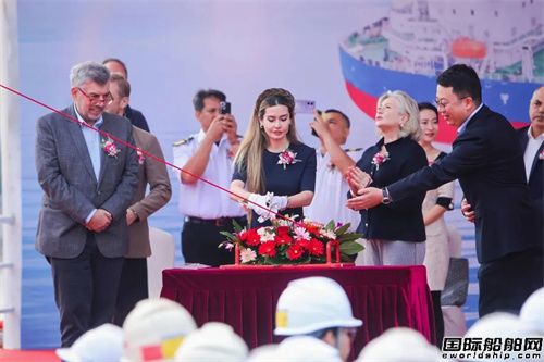 命名環節中,Lavinia公司總經理Ioannis Lagarias先生的女兒Adeline Lagaria女士為新船命名、砍纜,祝愿她航程平安、一帆風順。