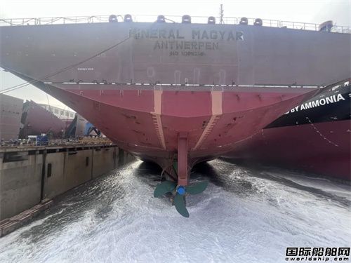 11月24日,北海造船為比利時CMB.TECH公司建造的21萬噸散貨船46號船和55號船順利出塢。21萬噸散貨船63號船首次實現“半船裝槳”工藝改進落地,標志著北海造船在綠色船舶建造工藝精益化方面取得重要進展,為系列船的高效建造注入了強勁動力。