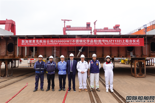 2025年12月22日上午10時58分,江西省新江洲船舶重工有限責任公司為新加坡船東MAC Shipping建造的25900DWT不銹鋼化學品系列船的2#船(船號NJZ1132)在公司301船臺舉行上船臺儀式。