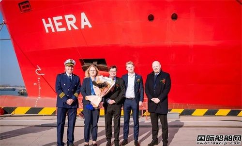 儀式現(xiàn)場融入了極具中國傳統(tǒng)文化特色的舞獅表演,船東代表Mrs.Ulrike Wegener和Mr.Jörn Mecklenburg上臺醒獅。隨后,在命名核心環(huán)節(jié),教母Mrs.Ulrike Wegener女士為DJHC6087輪正式命名為“HERA”輪,并敲香檳送祝福,祝愿新船此后航行順利,平安順遂。