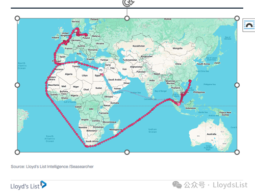 在開往歐洲的正程航線上,該船與多數類似規模的亞洲—北歐貿易集裝箱船一樣,經由好望角繞行。