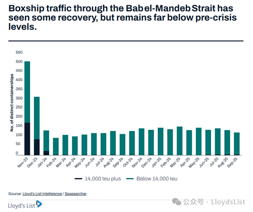 根據Lloyd’sList Intelligence的數據,與2024年相比,今年曼德海峽(Babel Mandeb Strait)的集裝箱船通過量略有上升,但仍遠低于危機前的水平。
