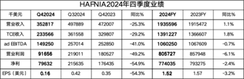 2024年四季度,Hafnia實(shí)現(xiàn)營業(yè)收入3.5億美元,同比減少25.3%;TCE收入為2.3億美元,同比減少29.2%;調(diào)整后的息稅折舊攤銷前利潤(EBITDA)為1.5億美元,同比減少41.0%;凈利潤達(dá)到7963.2萬美元,同比減少54.9%。