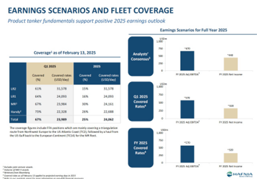 對于2025年一季度,Hafnia已經(jīng)以日均TCE23989美元鎖定了67%營運(yùn)日收入。對于2025年全年,Hafnia已經(jīng)以日均TCE24062美元鎖定了25%營運(yùn)日收入。
