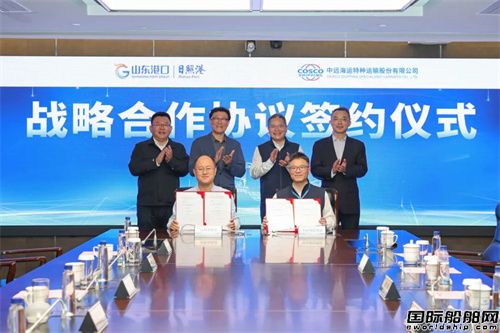 山東港口日照港集團黨委書記、董事長張江南,常務副總經理,黨委委員卞克,中遠海運特運董事長、黨委書記張煒,董事、總經理、黨委副書記黃南共同見證簽約,山東港口日照港集團副總經理、黨委委員周濤和中遠海運特運副總經理、黨委委員張馳分別代表雙方在協議上簽字。