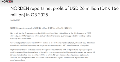 NORDEN表示,第三季度的業績表現主要得益于資產管理部門(Asset Management)帶來的穩健運營收益及船舶出售收益。公司前三季度累計凈利潤達1.11億美元,其中運營業務貢獻4300萬美元,船舶出售收益則高達6800萬美元。