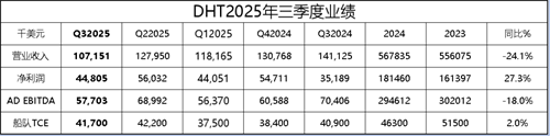 具體而言,2025年三季度,DHT實現(xiàn)營業(yè)收入1.1億美元,同比減少24.1%;調(diào)整后的息稅折舊攤銷前利潤(EBITDA)為5770.3萬美元,同比減少18.0%;凈利潤為4480.5萬美元或每股0.28美元,同比增長27.3%。