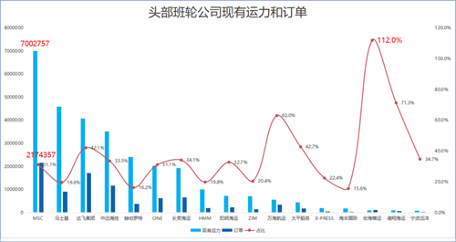 具體而言,在全球班輪公司運力100強中,地中海航運排名第1,運營955艘船,其中自有船舶688艘、租入船舶267艘,總艙位達到700.3萬TEU。此外,地中海航運還持有124艘,總計217.4TEU新造集裝箱船訂單。