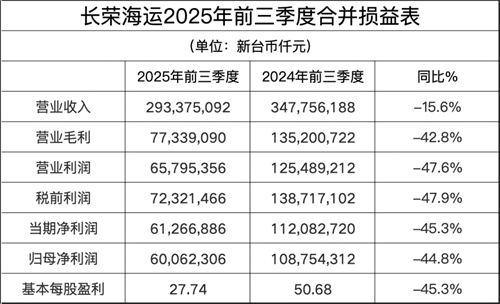 2025年前三季度,長榮海運累計實現(xiàn)營業(yè)收入新臺幣2933.8億元(約94.2億美元),同比下降15.6%;毛利為773.4億新臺幣(約24.8億美元);營業(yè)利潤為658.0億新臺幣(約21.1億美元);稅前利潤為723.2億新臺幣(約23.2億美元);前三季度凈利612.7億新臺幣(約19.7億美元);歸屬于母公司的凈利潤為600.6億新臺幣(約19.3億美元),或每股盈利27.74新臺幣。