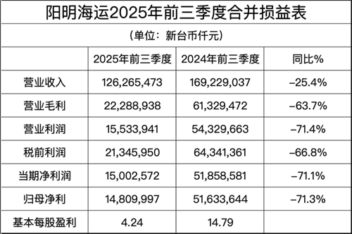 2025年前三季度,陽明海運累計實現(xiàn)營業(yè)收入新臺幣1262.6億元(約40.5億美元),同比減少25.4%;毛利為222.9億新臺幣(約7.2億美元),同比下降63.7%;營業(yè)利潤為155.3億新臺幣(約5.0億美元),同比下降71.4%;稅前凈利為213.4億新臺幣(約6.8億美元),同比下降66.8%;前三季度凈利150.0億新臺幣(約4.8億美元),同比下降71.1%;歸屬于母公司的凈利潤為148.1億新臺幣(約4.8億美元),同比下降71.3%,或每股盈利4.24新臺幣。