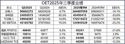具體而言,OET披露,2025年三季度,OET實現總收入9060.2萬美元,同比增長6.7%;TCE收入5994.6萬美元,同比增長14.9%;調整后息稅折舊攤銷前利潤(EBITDA)為4516.6萬美元,同比增長19.3%;凈利潤為2405.0萬美元,同比增長65.3%。