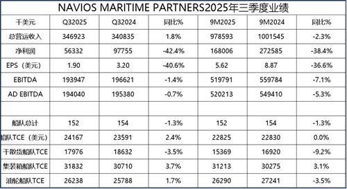 具體而言,2025年三季度,Navios Partners實現營業收入3.5億美元,同比增長1.8%;息稅折舊攤銷前利潤(EBITDA)為1.9億美元,同比下降1.4%;凈利潤為5633.2萬美元,同比下降42.4%;每股收益為1.90美元。