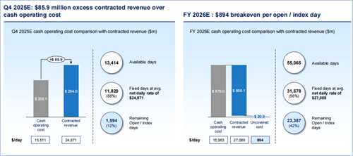 在經營上,Navios Partners采用簽訂了短期、中期和長期定期租船和貨運協議的形式。截至目前,Navios Partners已經分別鎖定2025年四季度和2026年約88.1%和57.5%營運日收入,日均租金分別為24871美元和27088美元。