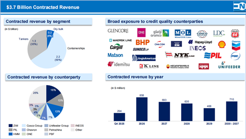 截至目前,Navios Partners擁有并運營一支由65艘干散貨船、51艘集裝箱船和55艘油輪組成的船隊,其中包括17艘新造船訂單,其中包括12艘阿芙拉型油輪/LR2新造船,以及根據光租合同租用的5艘新造MR2成品油輪。此外,還包括4艘7900TEU新造集裝箱船,預計2027年上半年交付;以及4艘8850TEU集裝箱船,預計2027年下半年和2028年一季度交付。