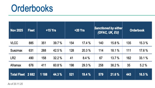 隨著新造船交付放緩和拆船減弱,油輪船隊將繼續老年化。行業分析師指出,全球17.4%的VLCC船隊、20.3%的蘇伊士型油輪船隊和20.5%的LR2型油輪船隊的船齡已超過20年。