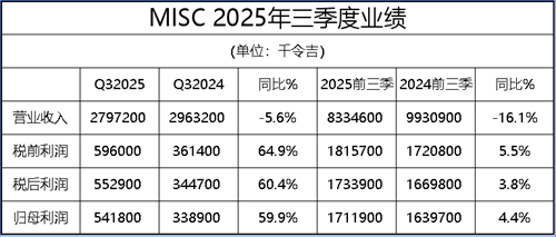 2025年前三季度,MISC實現營業收入83.3億令吉(約20.1億美元),同比減少16.1%;稅前利潤為18.2億令吉,同比增長5.5%;當期集團合并凈利潤為17.3億令吉(約4.2億美元),同比增長3.8%。