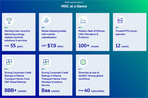 MISC成立于1968年,總部在馬來西亞的吉隆坡,MISC的控股公司為馬來西亞國家石油公司。目前MISC運營100+艘船舶,業務涵蓋船東業務(GAS Business)、油輪業務(AET)、船舶管理(Eaglestar)、碼頭業務(MMS)、船舶修造(MHB)、海工以及培訓(ALAM)等,是馬來西亞最大的航運和船舶修造企業。