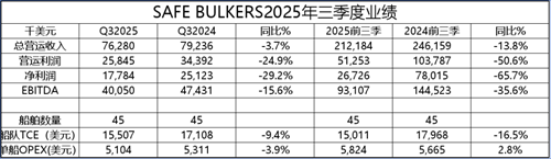 2025年前三季度,Safe Bulkers實現營業收入2.1億美元,同比減少13.8%;EBITDA為9310.7萬美元,同比減少35.6%;凈利潤達到2672.6萬美元,同比減少65.7%。其船隊日均TCE達到15011美元,同比減少16.5%;單船日均管理成本為5824美元,同比增加2.8%。