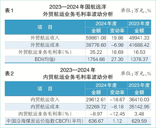 國際干散貨市場相對穩定的環境,為國航遠洋外貿航運業務提供良好的發展土壤。根據國航遠洋今年7月披露的數據,2024年度外貿航運收入達到59861.08萬元,較2023年度的49941.33萬元同比增長19.86%;外貿航運成本則從2023年度的41688.42萬元降至2024年度的38776.60萬元,同比下降6.98%;收入增長與成本下降的雙重作用下,2024年度外貿航運業務毛利率大幅提升至35.22%,較2023年度的16.53%增加18.69個百分點(見表1)。這一變化的背后,一方面是外貿航運市場行情回暖,BDI上漲直接帶動航運收入增長;另一方面則是公司2024年度外貿航運業務中的燃油采購成本下降,有效降低了整體運營成本。