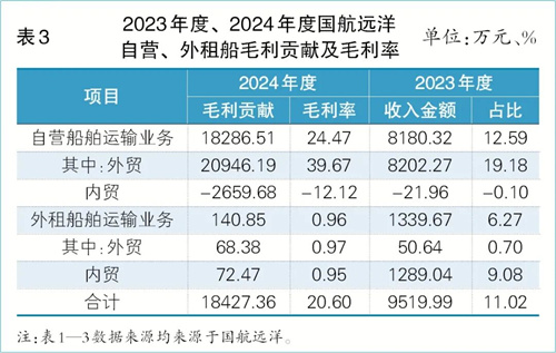 從國航遠洋的整體運力結構與業務模式來看,公司目前擁有內貿船及內外貿兼營船,采用以自營船舶運輸為主、外租船舶運輸為輔的運營模式,這一模式既有利于提升運力的可控性和運營靈活性,也能夠更好地滿足大型貨主客戶的保供需求,同時有效防范運力過剩或不足帶來的市場風險。從國航遠洋自營、外租船業務的毛利貢獻與毛利率表現分析,外貿運輸業務的優勢同樣十分突出。2024年度,公司自營船舶運輸業務實現毛利貢獻18286.51萬元,毛利率達到24.47%,較2023年度的毛利貢獻8180.32萬元和毛利率 12.59%均實現大幅提升;其中自營船舶外貿業務表現尤為亮眼,2024年度毛利貢獻達20946.19萬元,毛利率高達39.67%,而2023年度這兩項數據分別為8202.27萬元和19.18%;反觀自營船舶內貿業務,2024年度毛利貢獻為-2659.68萬元,毛利率為-12.12%,較2023年度的毛利貢獻-21.96萬元和毛利率-0.10% ,呈現明顯下滑態勢(見表3)。國航遠洋方面表示,這種分化格局的形成,主要是由于2024 年度外貿市場逐步回暖而內貿市場持續低迷,公司順勢將自營船舶運力逐步轉向外貿運輸領域所導致。