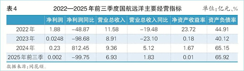 查閱國航遠洋2022年至2025年前三季度的業績報告,發現公司近年整體經營呈現波動下行態勢,尤其是核心盈利指標的持續承壓。數據顯示,凈利潤從2022年1.88億元一路跌至2024年僅剩0.23億元。今年前三季度,凈資產收益率只剩0.01%,幾乎歸零;與此同時,營業總收入從2022年11.58億元萎縮到6.93億元(今年前三季度),降幅累計超過四成,收入端持續失血,利潤端更是呈現“斷崖—微彈—再斷崖”的鋸齒形急跌(見表4)。在這樣的現金與利潤雙重缺口下,公司若繼續按原計劃訂造2艘干散貨新船,意味著要在交船節點一次性支付大額尾款并承擔后續折舊、財務費用及營運資金配套,而賬面盈利水平已無法覆蓋新增固定成本,交付即瞬間放大杠桿、吞掉僅剩的流動性。放棄訂單成為唯一可立即“止血”的選項:放棄案涉船建造合同后,公司無需再為2艘新船支付相關進度款,資本開支驟降,利息支出和折舊壓力被主動“凍結”,避免在收入尚未恢復的階段再疊加高額剛性成本。
