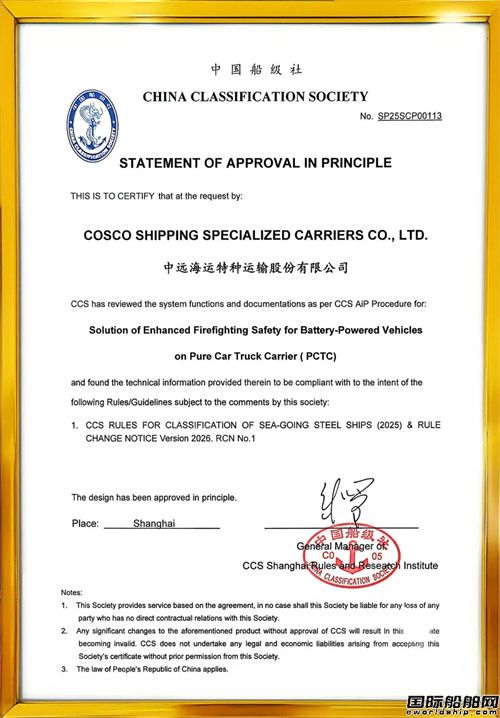 2025年12月2日,在被譽(yù)為“全球海事業(yè)風(fēng)向標(biāo)”的2025年中國(guó)國(guó)際海事會(huì)展(Marintec China 2025)系列活動(dòng)中,中遠(yuǎn)海運(yùn)特運(yùn)旗下遠(yuǎn)海汽車船公司獲中國(guó)船級(jí)社(CCS)頒發(fā)《滾裝運(yùn)輸鋰電池電動(dòng)汽車增強(qiáng)消防安全技術(shù)要求》首張?jiān)瓌t性認(rèn)可(AIP)證書。這標(biāo)志著中國(guó)在新能源汽車海運(yùn)安全技術(shù)領(lǐng)域?qū)崿F(xiàn)重要突破,以領(lǐng)先的船舶消防系統(tǒng)設(shè)備布置與安全管理體系,為蓬勃發(fā)展的新能源汽車出口構(gòu)建起高標(biāo)準(zhǔn)、高可靠性的運(yùn)輸保障。