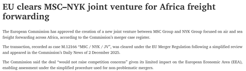 據悉,該交易在歐盟并購條例下,通過簡易審查程序獲批,案件編號為M.12166“MSC/NYK/JV”,并于12月2日發布在歐盟委員會的每日公告中。
