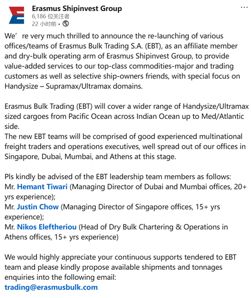 根據(jù)益洋航運(yùn)官方社交媒體的聲明,作為 Erasmus Shipinvest 集團(tuán)的附屬成員和運(yùn)營機(jī)構(gòu),EBT 將為公司一流的大宗商品貿(mào)易客戶以及部分船東合作伙伴提供增值服務(wù)。EBT旗下多個辦事處/團(tuán)隊(duì)已重新啟動運(yùn)營,業(yè)務(wù)重點(diǎn)業(yè)務(wù)重點(diǎn)瞄準(zhǔn)靈便型、超靈便型及極靈便型船市場,并覆蓋太平洋、印度洋乃至地中海/大西洋等主要航線。