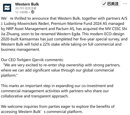 根據披露,作為一家在奧斯陸上市的航運企業,Western Bulk 此次與 J. Ludwig Mowinckels Rederi、由 NRP Asset Management 管理的 Premium Maritime Fund 2024 以及 Pactum 共同出資,購入“CSSC Shi Jia Zhuang”輪。該船交割后將更名為“Western Egda”輪。Western Bulk 在該項目中持股22%,相關交易預計將于下周完成。