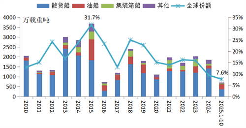 2025年以來,全球新造船市場(chǎng)行情有所降溫,日本新船成交量進(jìn)一步走低,1-10月共計(jì)成交173艘、721.9萬載重噸、254.3萬修正總噸,以載重噸和修正總噸計(jì)分別同比下降56%和50%,僅分別占全球新船成交總量的7.6%和6.6%,創(chuàng)下新世紀(jì)以來的最低水平。主要原因是當(dāng)前日本造船企業(yè)的生產(chǎn)資源和勞動(dòng)力資源較為緊張,新船排期至2028年后,難以滿足新造船市場(chǎng)需求。