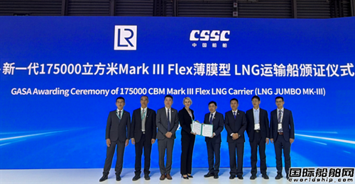 本次展會上,法國船級社(BV)為江南造船自主研發(fā)設計的新一代17.5萬立方米Mark III Flex薄膜型LNG運輸船頒發(fā)AiP證書。英國勞氏船級社(LR)及挪威船級社(DNV)為這型新一代175,000立方米Mark III Flex薄膜型LNG運輸船頒發(fā)GASA證書。
