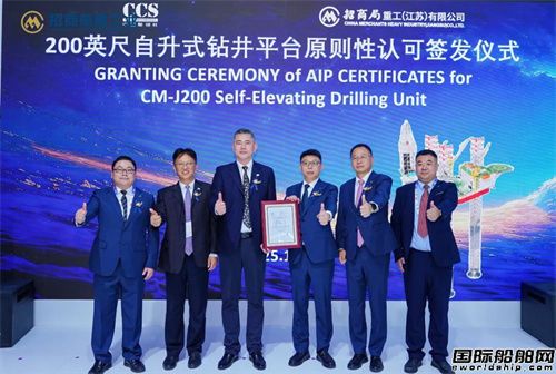 中國船級社為招商局重工(江蘇)有限公司200英尺自升式鉆井平臺頒發原則性認可證書。