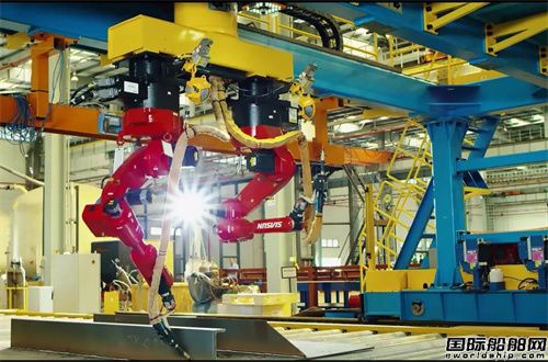 該生產(chǎn)線主要用于船體縱橫肋板等小組立構(gòu)件的焊接生產(chǎn),由焊接作業(yè)平臺、視覺識別系統(tǒng)、焊接機器人、焊接系統(tǒng)、中央控制系統(tǒng)等構(gòu)成,具有工件和焊縫自動識別、焊接過程自動跟蹤、自動分配工作任務(wù)以及自動保護等功能。該生產(chǎn)線采用先進焊縫識別與定位技術(shù)和多模態(tài)智能感知系統(tǒng),可實現(xiàn)船舶小組立平角、立角、包角的機器人自動焊接,生產(chǎn)過程數(shù)據(jù)可追溯,相較于傳統(tǒng)焊接方式,焊接生產(chǎn)效率可提升30%以上,焊接質(zhì)量一次合格率98%以上。