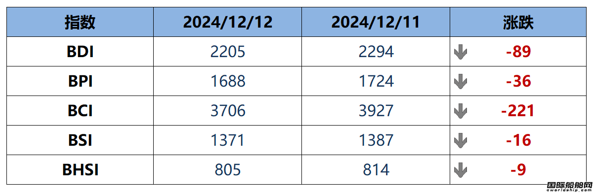 國際船舶網12月12日消息,波羅的海干散貨運價指數(BDI)上周五下跌89點,或環比下降3.88%至2205點。波羅的海好望角型散貨船運價指數(BCI)下降221點,或環比下降5.63%至3706點。波羅的海巴拿馬型散貨船運價指數(BPI)下降36點,或環比下降2.09%至1688點。波羅的海超靈便型散貨船運價指數(BSI)下降16點,或環比下降1.15%至1371點。波羅的海靈便型散貨船運價指數(BHSI)下降9點,或環比下降1.11%至805點。