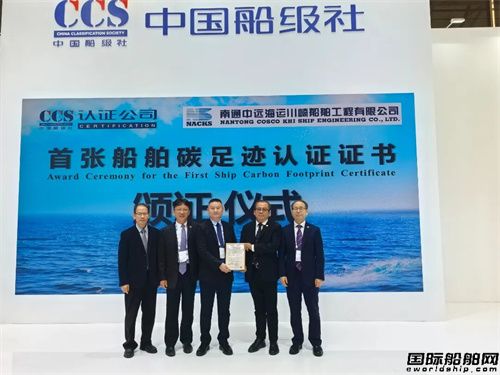 中國船級社質(zhì)量認證有限公司為南通中遠海運川崎船舶工程有限公司頒發(fā)了CCS首張船舶碳足跡認證證書。該證書的簽發(fā)標志著中國造船業(yè)在碳信息披露和產(chǎn)品碳足跡認證方面取得關(guān)鍵突破,該證書的簽發(fā)標志著CCS在我國碳信息披露和產(chǎn)品碳足跡認證方面構(gòu)建了領(lǐng)先行業(yè)的標準體系,以實際行動引領(lǐng)全球綠色造船新潮流,為踐行“雙碳”目標樹立了行業(yè)新標桿。CCS江蘇分社副總經(jīng)理杭仲九和中國船級社質(zhì)量認證有限公司副總經(jīng)理付治深出席儀式,中國船級社質(zhì)量認證有限公司江蘇分公司總經(jīng)理劉忠基為南通中遠海運川崎船舶工程有限公司副總經(jīng)理周蘭喜頒發(fā)證書。