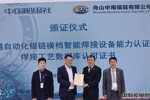 CCS為舟山中南錨鏈有限公司研發(fā)的自動化錨鏈橫檔智能焊接系統(tǒng)頒發(fā)智能焊接設備能力認證證書和焊接工藝數(shù)據(jù)庫認可證書。該自動化錨鏈橫檔智能焊接系統(tǒng)為獲CCS認可的首臺針對船用錨鏈橫檔焊接的專用設備,具備自動化進料、智能規(guī)劃焊接路徑、多機協(xié)同焊接、智能集成控制等特點。 CCS浙江分社總經(jīng)理李曄為舟山中南錨鏈有限公司鮑中南董事長頒發(fā)智能焊接設備能力認證證書和焊接工藝數(shù)據(jù)庫認可證書。