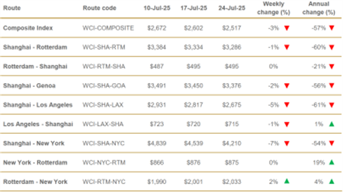 與此同時,截至7月24日,Drewry世界集裝箱運價指數(WCI)環比上周下跌3.3%,約為2517美元/FEU。