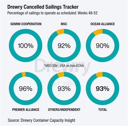 未來(lái)五周(第48周11月24-30日至第52周12月22-28日),全球主要航線已公告取消48個(gè)航次,占原定719個(gè)航次的7%。其中跨太平洋東向航線成為受影響最嚴(yán)重的區(qū)域,占比高達(dá)48%,其次分別是亞洲-歐洲/地中海航線(29%)和跨大西洋西向航線(23%)。盡管有此調(diào)整,目前仍有93%的航次維持正常運(yùn)營(yíng)。