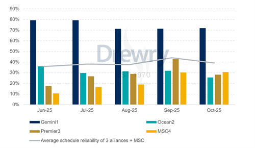 通過分析船舶在港待時與船期可靠性(以船舶在預報到港時間2-6周內,實際抵達偏差不超過24小時的百分比衡量),德路里發現,亞歐航線在經歷連續五個月的改善后,十月份準時到港率從44%回落至39%。市場反饋顯示,當前支線運輸船舶在歐洲港口面臨的延誤風險尤為突出。