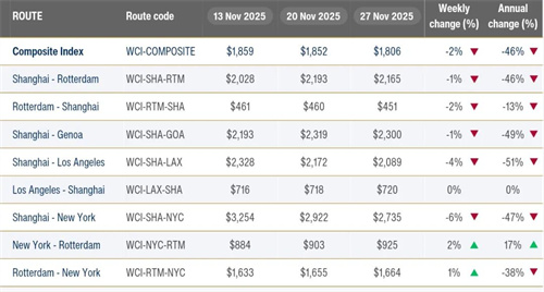 在連續六周上漲后,本周亞歐航線即期運價出現回落,上海至熱那亞和鹿特丹的運價均下跌1%,分別報2300美元和2165美元/FEU。為在即將到來的年度合約談判季前提振運價,該航線多家船司宣布自12月1日起實施更高的FAK,標準定為3100至4000美元/FEU。
