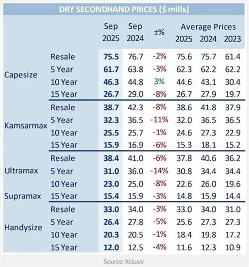 紐卡斯爾型船板塊,韓進重工2012年建造的20.5萬噸級Mineral Cloudbreak輪以3900萬美元售予香港買家;Koyo造船2013年建造的18.2萬噸級Wakayama Maru輪以3700萬美元易主阿斯亞德航運(Asyad)旗下的客戶。卡姆薩爾型船板塊,今治造船2016年建造的8.2萬噸級Nord Taurus輪以2750萬美元成交。巴拿馬型船板塊,常石造船2007年建造的7.6萬噸級Alpha Loyalty輪在待完成干塢檢驗條件下,以1025萬美元售予中國買家;而常石造船2004年建造的7.7萬噸級Eirini 輪則以850萬美元易主。極大靈便型船板塊,Shin Kasado造船2021年建造的6.3萬噸級CMB Teniers輪與2020年建造的CMB Van Dijck輪以超過6500萬美元總價打包售予現代商船關聯客戶;南通江宇造船2020年建造的6.3萬噸級配備脫硫塔的Elizabeth M II輪以3000萬美元轉手;三井造船2015年建造的6.7萬噸級配備電子主機的Bulk Castor輪則以2400萬美元成交;三井造船2014年建造的6.7萬噸級同時配備脫硫塔與電子主機的African Cheetah輪,以2400萬美元售予孟加拉國買家。超靈便型船板塊,大島造船2007年建造的5萬噸級開放式艙口型船Queen Flower輪以1600萬美元的價格售予Devbulk關聯客戶。靈便型船板塊,臺州楓葉船業2011年建造的3.2萬噸級T Symphony輪以850萬美元成交;浙江正和造船2010年建造的3.4萬噸級姐妹船CH Doris輪與CH Bella輪,在待完成特檢/干塢條件下,均以820萬美元的單價易主。