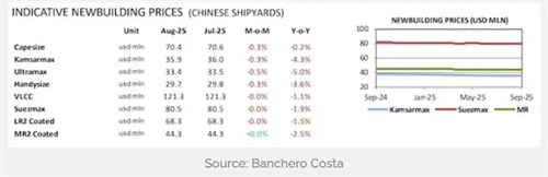 船舶經紀公司Banchero Costa補充指出,卡姆薩爾型散貨船板塊,揚子江造船2017年建造的8.2萬噸級TR LADY輪以2400萬美元的價格售予希臘買家。巴拿馬型散貨船板塊,常石造船2004年建造的7.6萬噸級EIRINI P輪以850萬美元成交。超靈便型散貨船板塊,巖城造船2012年建造的6.1萬噸級EXPLORER EUROPE輪以1830萬美元的價格售予中國買家。靈便型散貨船板塊,浙江正和造船2010年建造的3.3萬噸級姐妹船CH BELLA輪與CH DORRIS輪分別以820萬美元的單價易主。阿芙拉型油輪板塊,外高橋造船2008年建造的10.5萬噸級OLYMPIC SEA輪及其姐妹船OLYMPIC SKY輪(同廠2008年建)均以2950萬美元的單價成交。