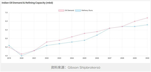航運界網(wǎng)消息,船舶經(jīng)紀公司Gibson在其最新報告中指出,印度日益增長的煉油產(chǎn)能與國內消費動態(tài),可能在短期內為油輪市場,包括成品油輪和原油油輪,提供顯著支撐。