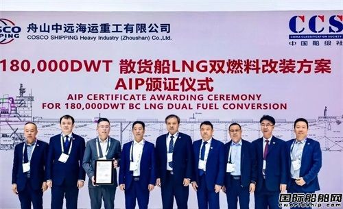 12月2日,舟山中遠海運重工還獲得了由CCS上海規范研究所頒發的“180000DWT散貨船LNG雙燃料改裝方案”AIP(原則性認可)證書。