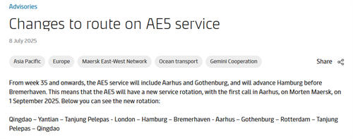 本月,雙子星聯(lián)盟成員赫伯羅特與馬士基宣布,其亞洲-歐洲AE5/NE4航線將自9月起臨時調(diào)整掛港順序。新方案將漢堡港靠泊順序調(diào)整至不來梅哈芬港之前,并新增丹麥奧胡斯港與瑞典哥德堡港。兩家公司表示,此次調(diào)整旨在提升船期可靠性,應(yīng)對港口擁堵波動。