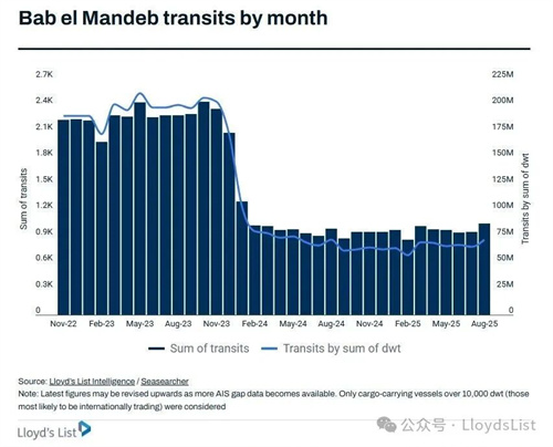 初步數(shù)據(jù)顯示,2025年8月通過這一咽喉要道的航次為1,044次,較2025年7月的952次增長近10%。